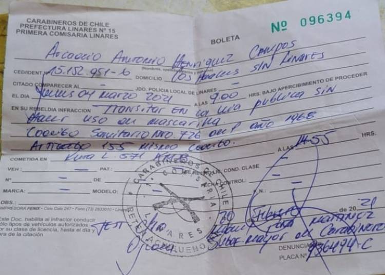 "Nosotros creemos y seguimos sosteniendo que faltó criterio y que el vecino no debió ser infraccionado. A diario vemos a cientos de linarenses en el área urbana sin mascarilla y no sucede absolutamente nada. Decidimos presentarnos en el tribunal y cancelar la multa establecida para estos efectos. La actuaria le explicó el caso a la jueza subrogante de Policía Local y ella estableció una multa de 20 mil pesos", comentó Mónica Henríquez a Séptima Página Noticias.